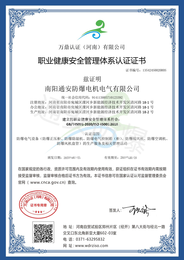 职业健康安全管理体系认证证书